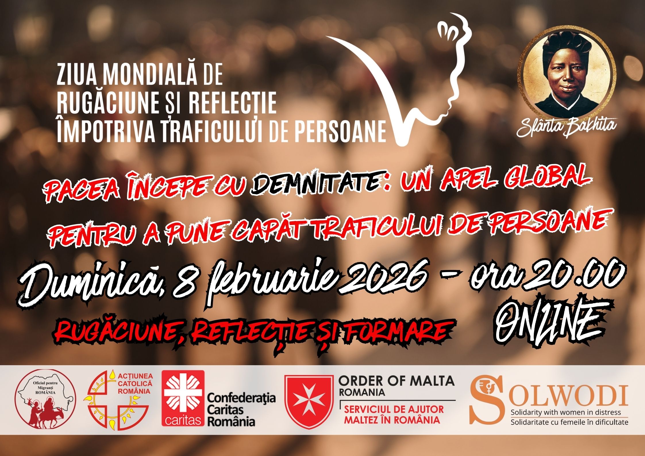 Cu ocazia Zilei Mondiale de Rugăciune și Reflecție împotriva Traficului de Persoane, Oficiul pentru Migranți al Conferinței Episcopilor din România, Acțiunea Catolică România, Confederația CARITAS România, Serviciul de Ajutor Maltez din România și Asociația SOLWODI vă invită să luați parte la o seară de rugăciune, reflecție și formare, dedicată conștientizării realității dureroase a traficului de persoane, care rănește profund demnitatea umană, precum și susținerii victimelor acestui fenomen atât de prezent în România.