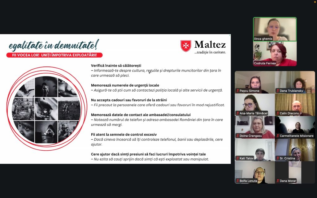 Partea de formare a fost susținută de Ilinca Ghemis, asistent social în cadrul  Organizației Serviciul de Ajutor Maltez din România, care a explicat clar criteriile care definesc traficul de persoane. Mesajul-cheie a fost ferm: oricine poate deveni victimă, iar prevenția începe cu gesturi foarte concrete. Participanții au primit recomandări practice: să nu își lase actele la nimeni, să verifice contractele și ofertele „prea bune ca să fie adevărate”, să păstreze legătura cu familia și prietenii, să își creeze un cod de siguranță cu o persoană de încredere și să își protejeze identitatea online (cont privat, atenție la poze și informații personale). De asemenea, a fost reamintit că, în situații de risc sau suspiciune, se poate solicita sprijin instituțional prin Agenția Națională Împotriva Traficului de Persoane.